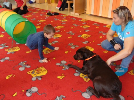 Ke konci hodiny následovaly hry na zklidnění a soustředění „Vyhledávání pamlsků v pěstích rukou“- do jedné z ruky dáme pamlsek a ruku zavřeme v pěst. Děti jsme položili na koberec obličejem dolů a pes pamlsek vyhledává, snaží se k němu dostat a olizuje pěst a různé části těla, což působí jako masáž. Pěst povolíme a pes dostává pamlsek pokračuje k dalšímu dítěti. Pes pěsti dětí neolizuje, pouze se jemně dotýká čumákem pěstí dětí. Poslézé dochází k polohování dětí a pejska, následné podlézání a zapínání postrojů.