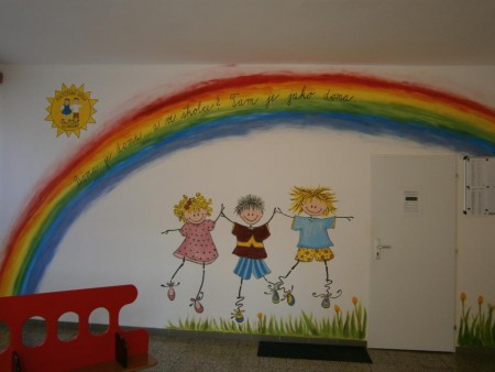 - velmi hezky a vkusně je vyzdoben i interiér mateřské školy. K naší společné tvořivé práci používáme převážně přírodních materiálů, veselých barev a můžeme se pochlubit hezkými malbami, výtvory dětí i dospělých.